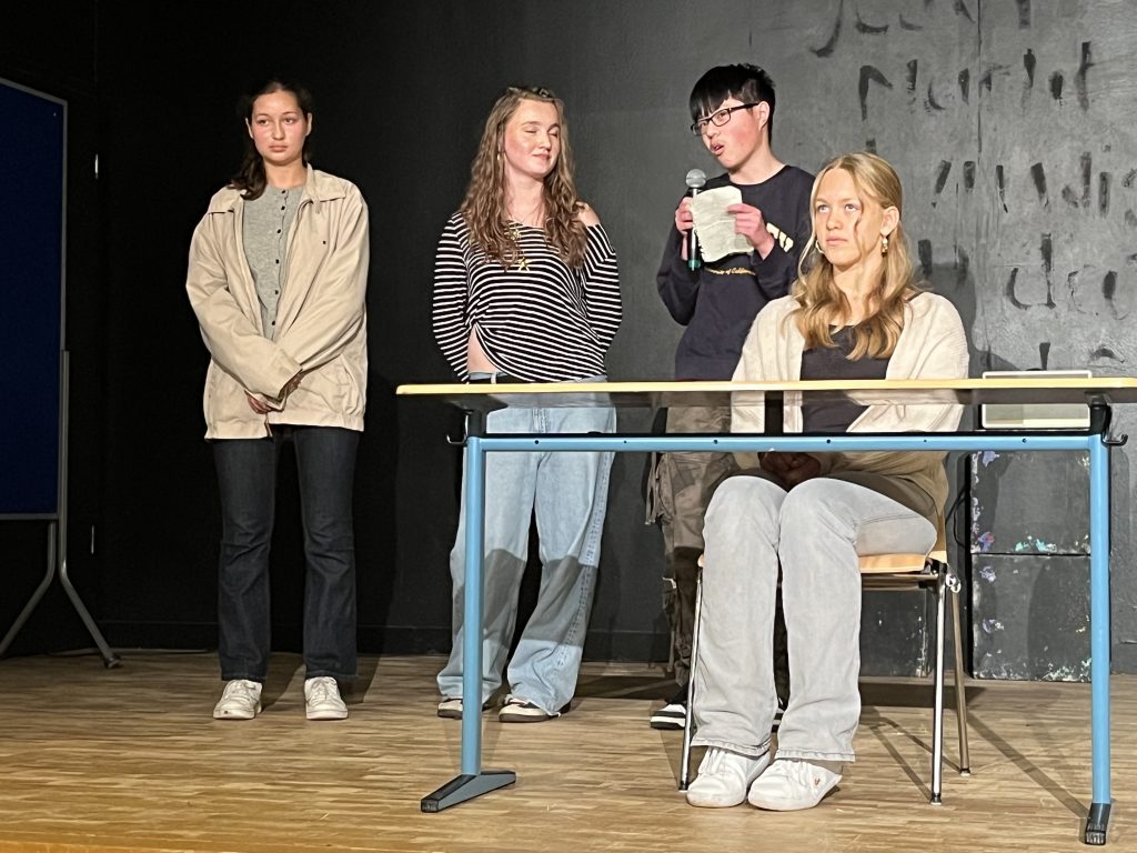 Am Ende einer ereignisreichen Herbst-Projektwoche gab es am letzten Freitag viel Applaus und Wertschätzung für die von Frau Seegers (Projektorganisation) moderierte Präsentation der Ergebnisse der thematisch vielseitigen Projekte im Meitner- Forum. Die Jahrgänge 9 + 10 konnten zwischen 12 verschiedenen Projekten wählen, die ganz unterschiedliche Schwerpunkte und Interessen zwischen Schauspiel und Theater, einer Schreibwerkstatt, einer Planung und Zubereitung eines „Fairfood-Diners“, einem Bauprojekt zu Sitzbänken aus Paletten, Modellbau, Kunst machen u. eine Ausstellung planen, Demokratie erleben und Politisches Handeln ausprobieren, einem Geschichtomat, bis hin zu Angeln an Elbe und Alster abbildeten.