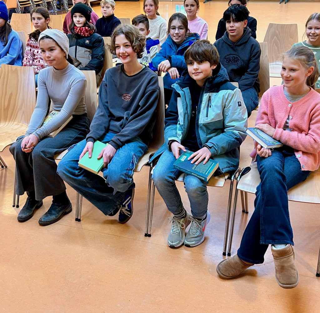 Angefeuert von den Supportern aus den Klassen präsentierten Ella S. (6a), Adrian H. (6b), Thea S. (6c) und Malia S. (6d) in gemütlicher Atmosphäre zuerst eine dreiminütige Leseprobe ihres Könnens anhand eines frei gewählten und vorbereiteten Wahltextes. Alle vier und auch die Texte wie „Mittsommerbande“ von C. Wieja oder „Ich, Kleopatra und die alten Ägypter von F. Schwieger/ R. Wultscher begeisterten die Jury und machten die Entscheidung schwer.